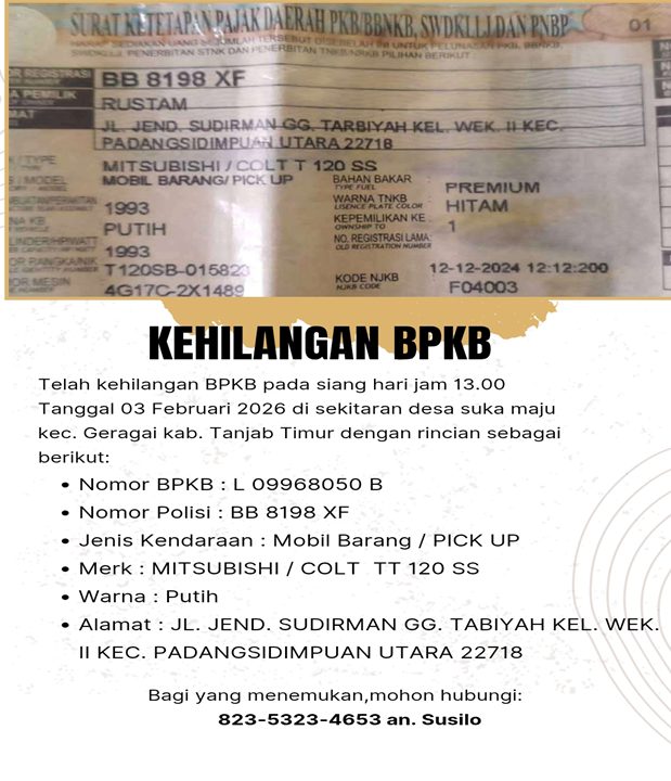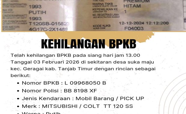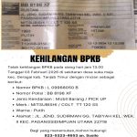 TANJAB TIMUR, garudanusantara.net – Di Informasikan Kepada Seluruh Masyarakat Tanjab timur jambi telah hilang dokumen kendaraan berupa Buku Pemilik Kendaraan Bermotor (BPKB). Untuk identitas BPKB...