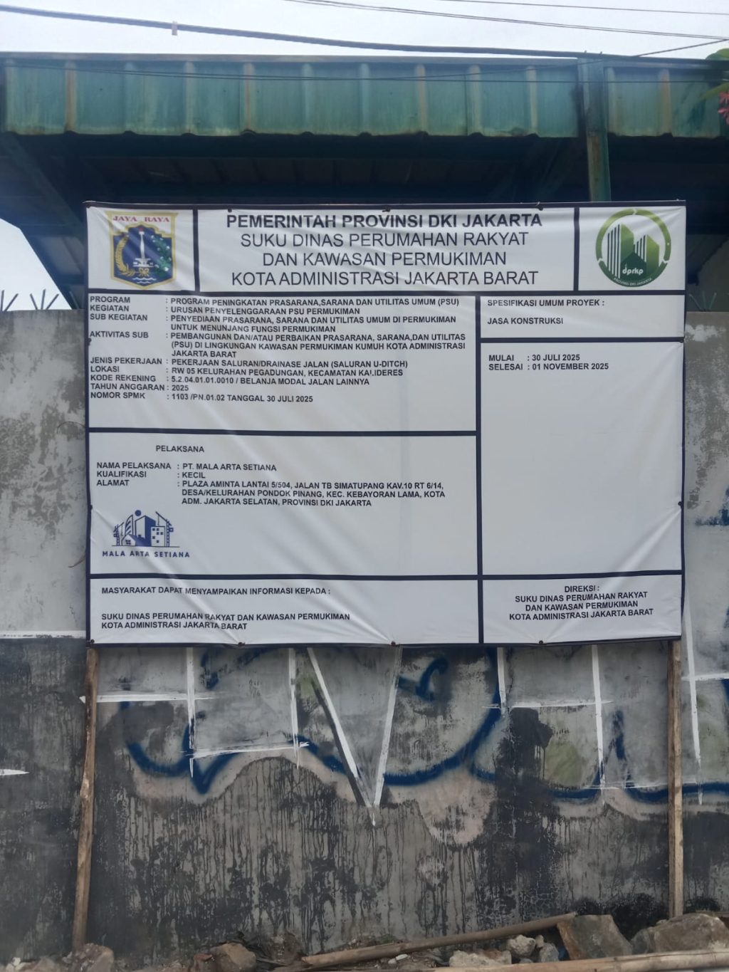 Lokasi berada di RW 05, kelurahan Pegadungan kec Kalideres,Jakarta Barat. Warga menyoroti papan proyek yang tidak mencantumkan nilai anggaran secara jelas, sehingga menimbulkan tanda tanya terkait transparansi penggunaan dana publik.